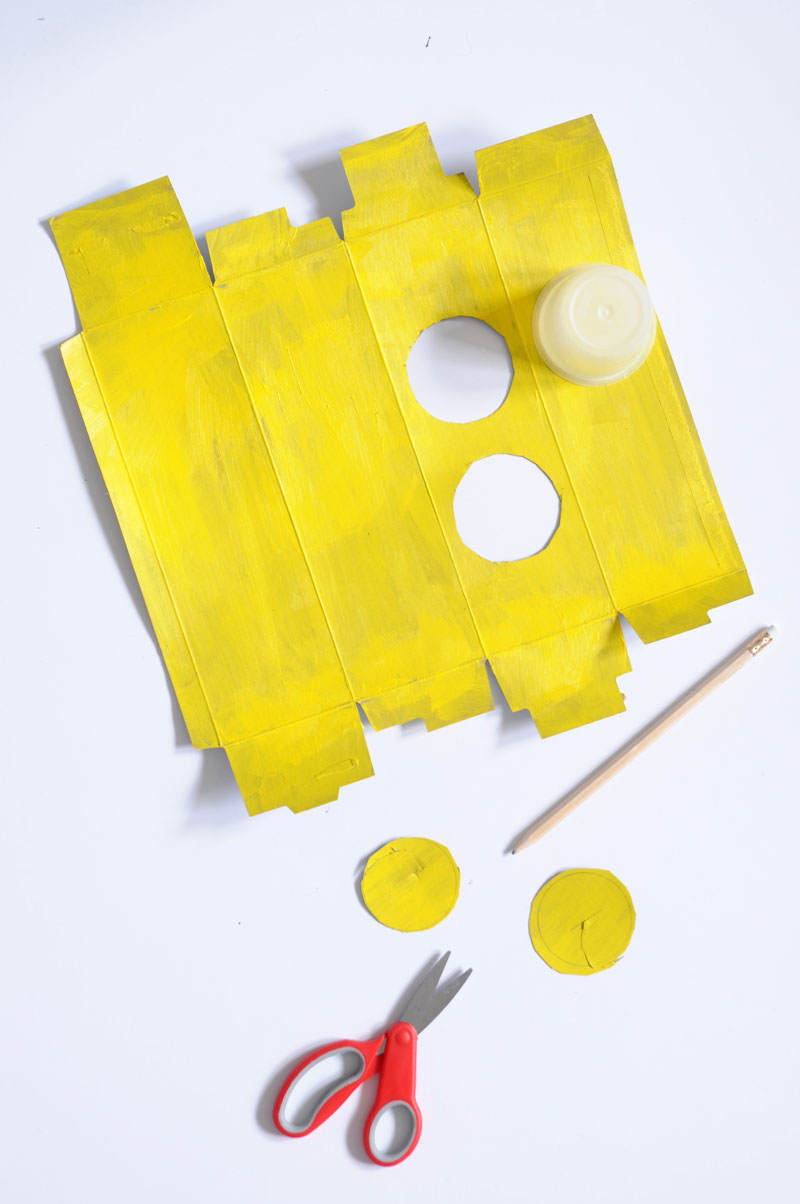 Unfold the cracker box and paint the inside yellow. Paint the outside of small jewelry box yellow (set aside the lid—save it for another project). Let both dry.