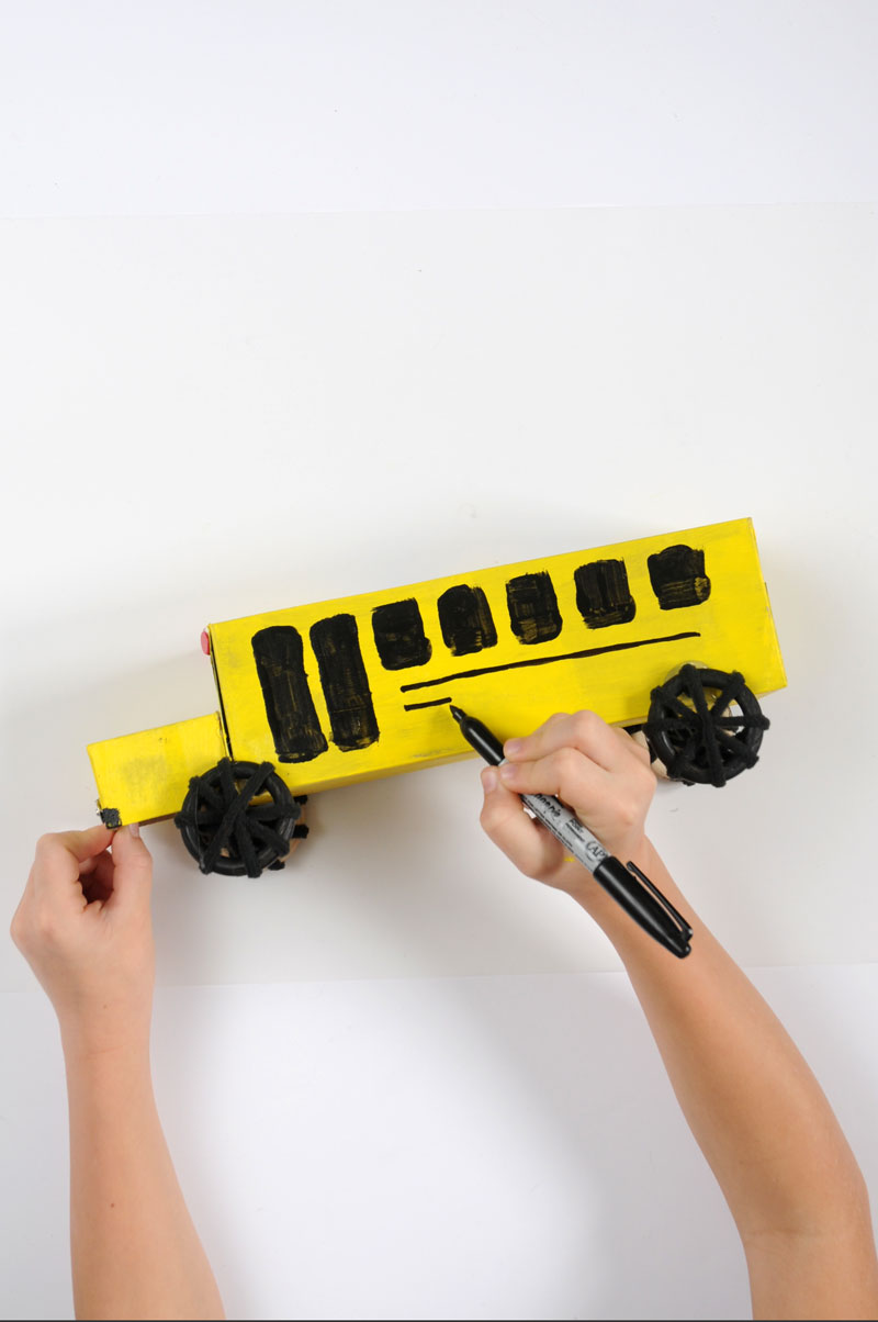 4. Paint six windows on each side of the bus; paint two doors, the front windshield, and a front bumper onto the bus with chalkboard paint (refer to page 49 for placement). The bus windows should be about 1 inch square and the doors about 1 inch wide by 2 inches tall. The windshield should cover most of the area above the hood, leaving just a slim yellow frame. To make the bumper, paint a thin black stripe along the bottom, open end of the jewelry box.