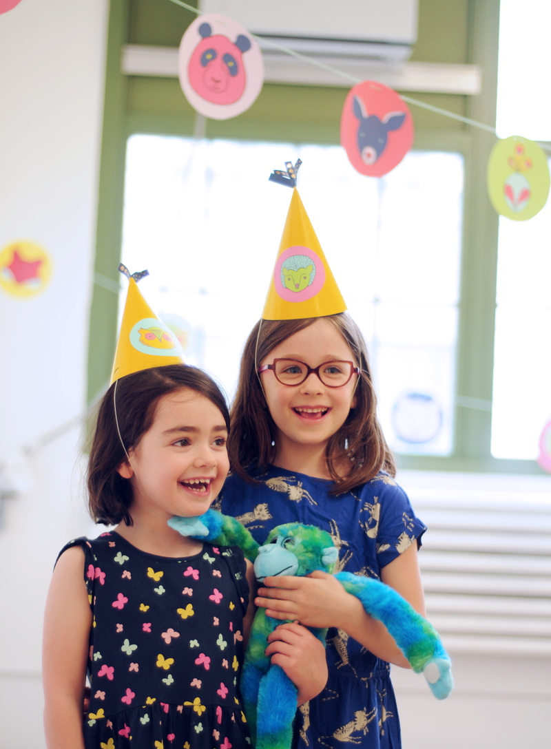 To carry the animal theme, we used the adorable paw print symbol to make ribbon tassels for the tops of basic party hats. Here is a free printable that you can use to print out these cute, animal hat medallions.